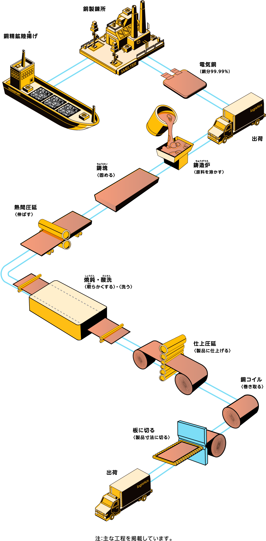 鉱山で採掘された銅鉱石は、製錬所に運ばれ、炉に入れられる。そこで高温に熱し、溶かし、不純物を取り除き、純度99%の粗銅をつくるんだ。これをさらに精製し純度99.99%の銅地金になるんだよ。銅地金は銅板工場に運ばれ、そこで炉に入れて溶かされ、厚い板状の鋳塊をつくるんだ。これを圧延機でどんどん薄く伸ばしていき、目的の厚さになったものをコイル状に巻き取っていく。これを決められた寸法に切り、銅板として出荷されるんだ。